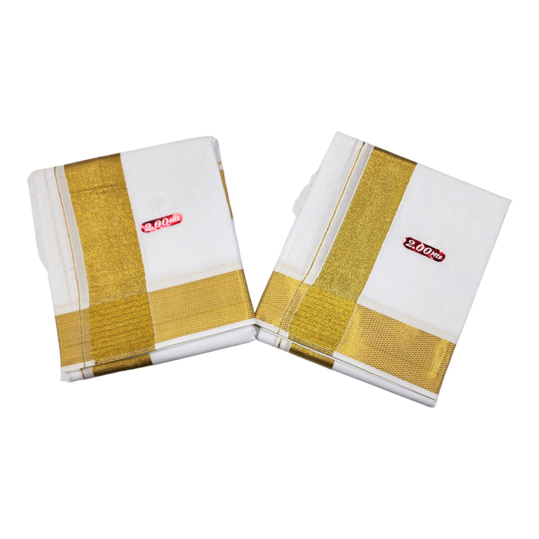 Mens 100% Pure Cotton Bleached White Dhoti With Cotton Big Gold Zari Border(2 PCs Combo)