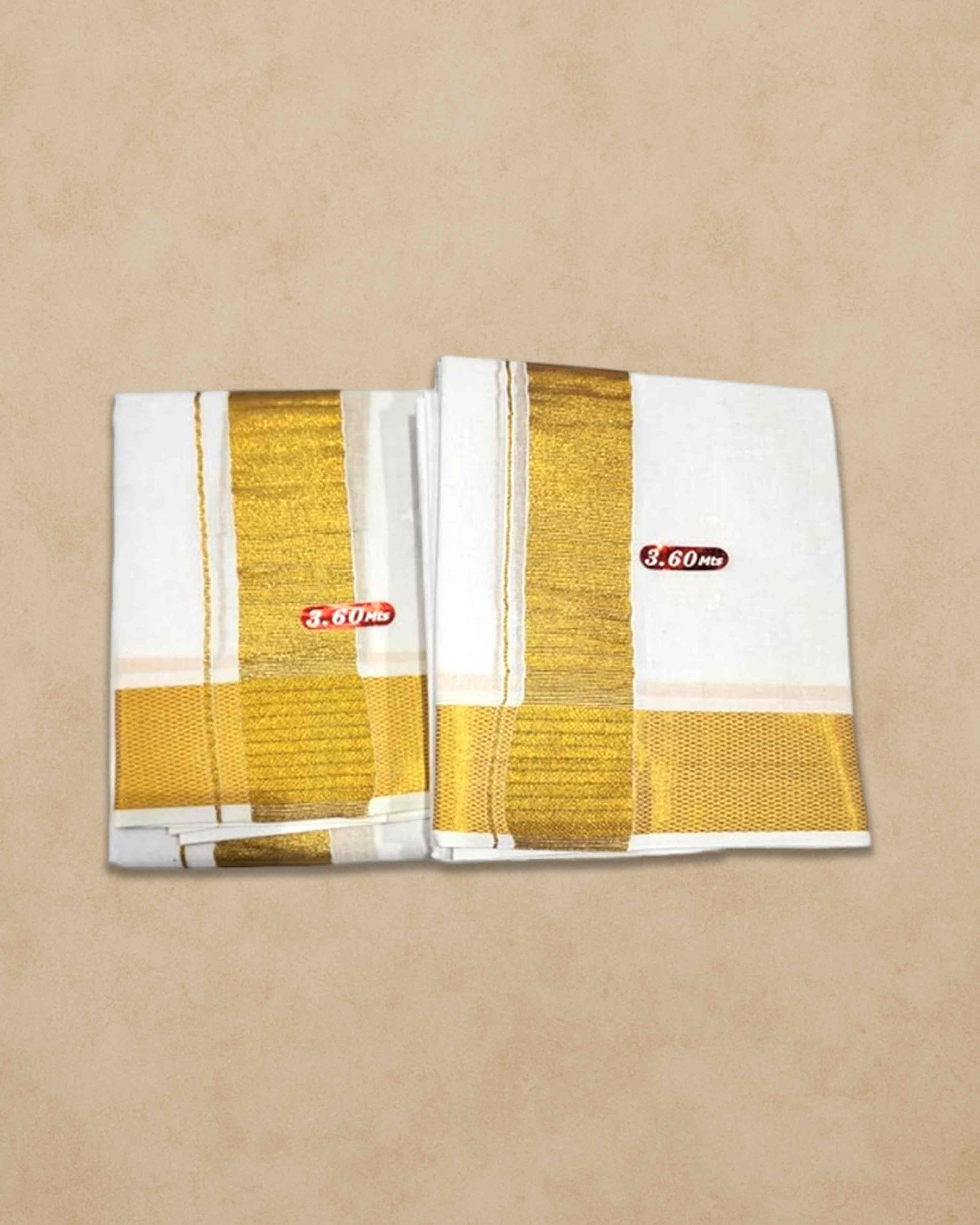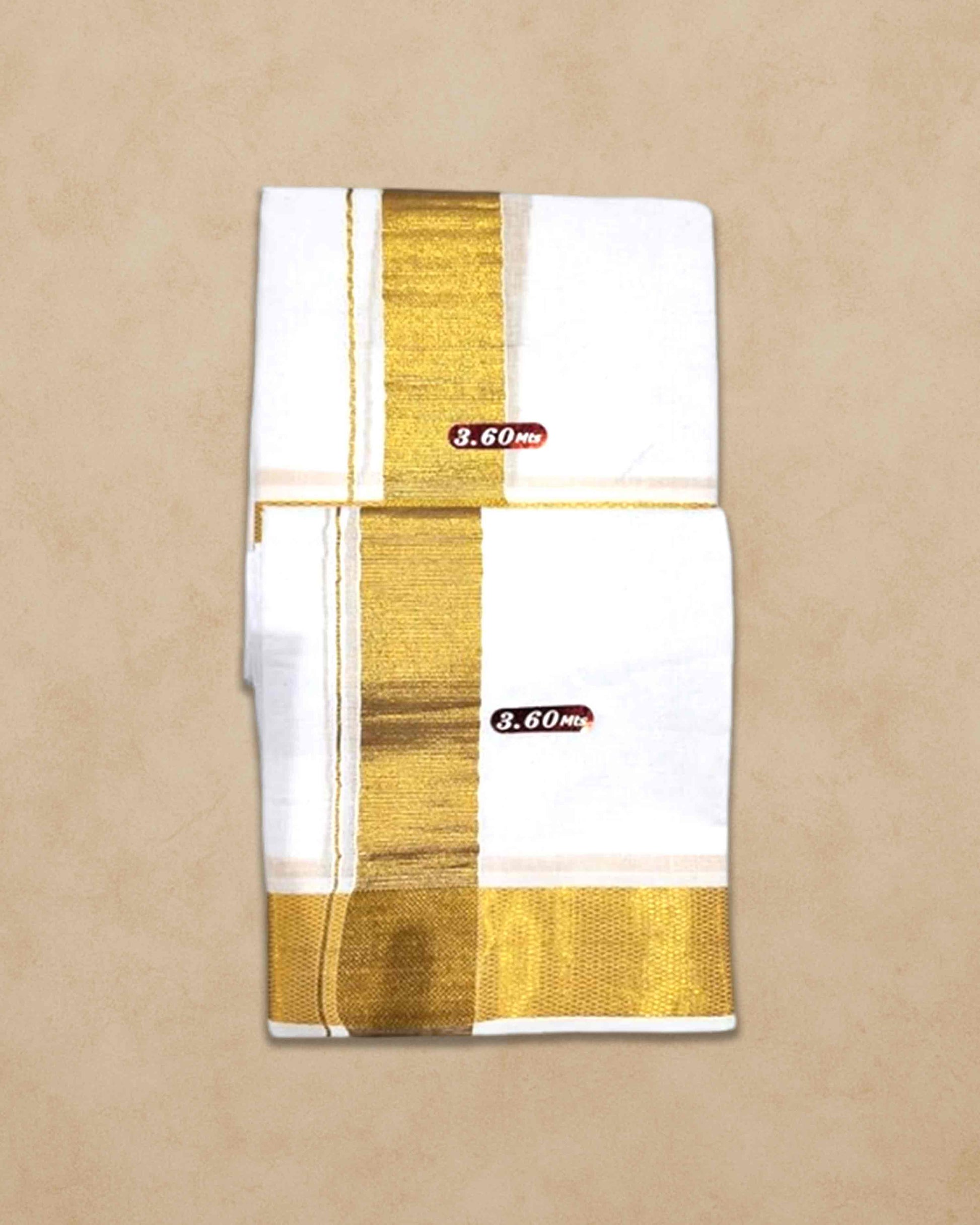 100% Pure Cotton Bleached White Dhoti With Cotton Big Gold Zari Border