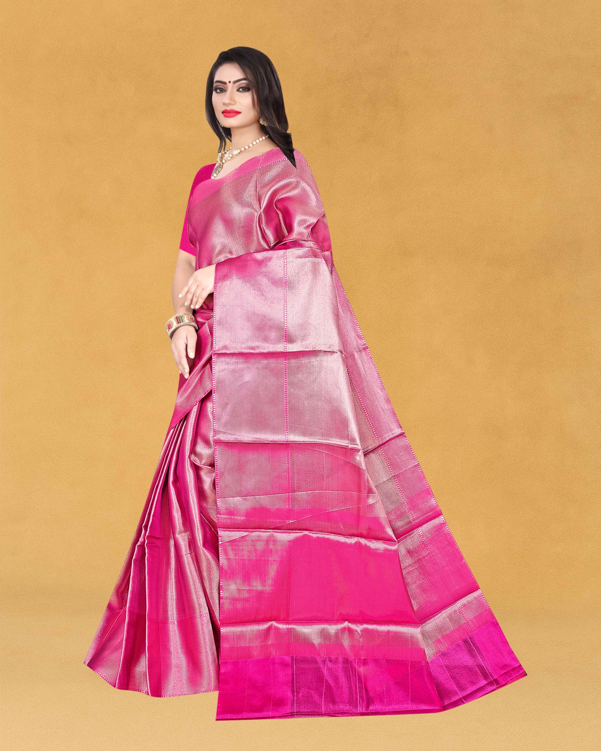 - Elegant Banarasi Design: Traditional Banarasi tissue silk saree with pink zari border and all-over zari weaving for a regal look.