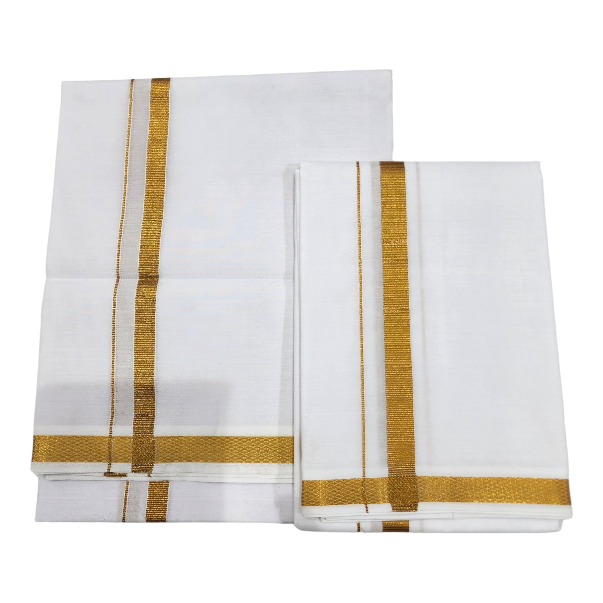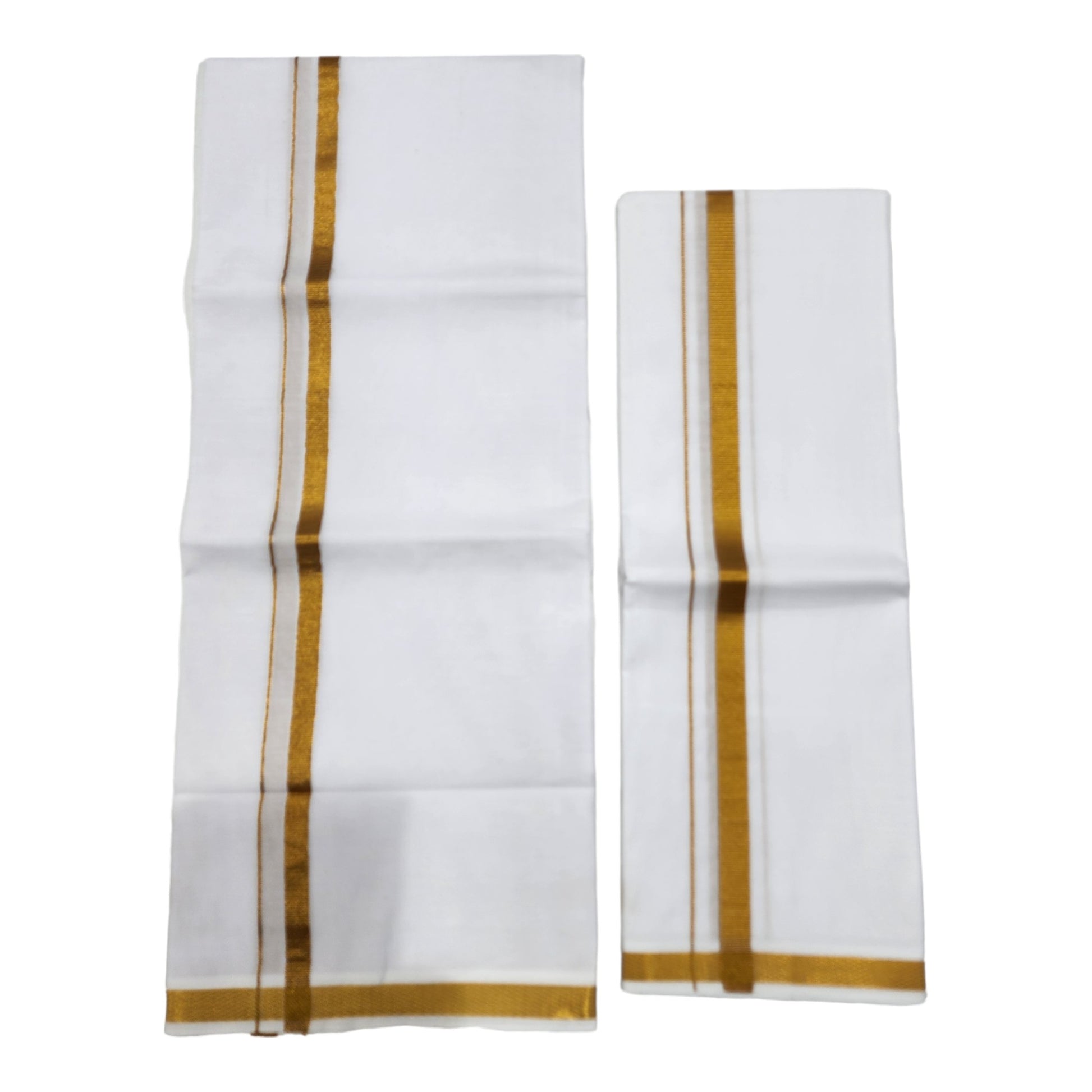 Mens Single Poly Cotton Dhoti 2Mts White with Gold Jari Border 1/2 & Towel (1.80mts) Set