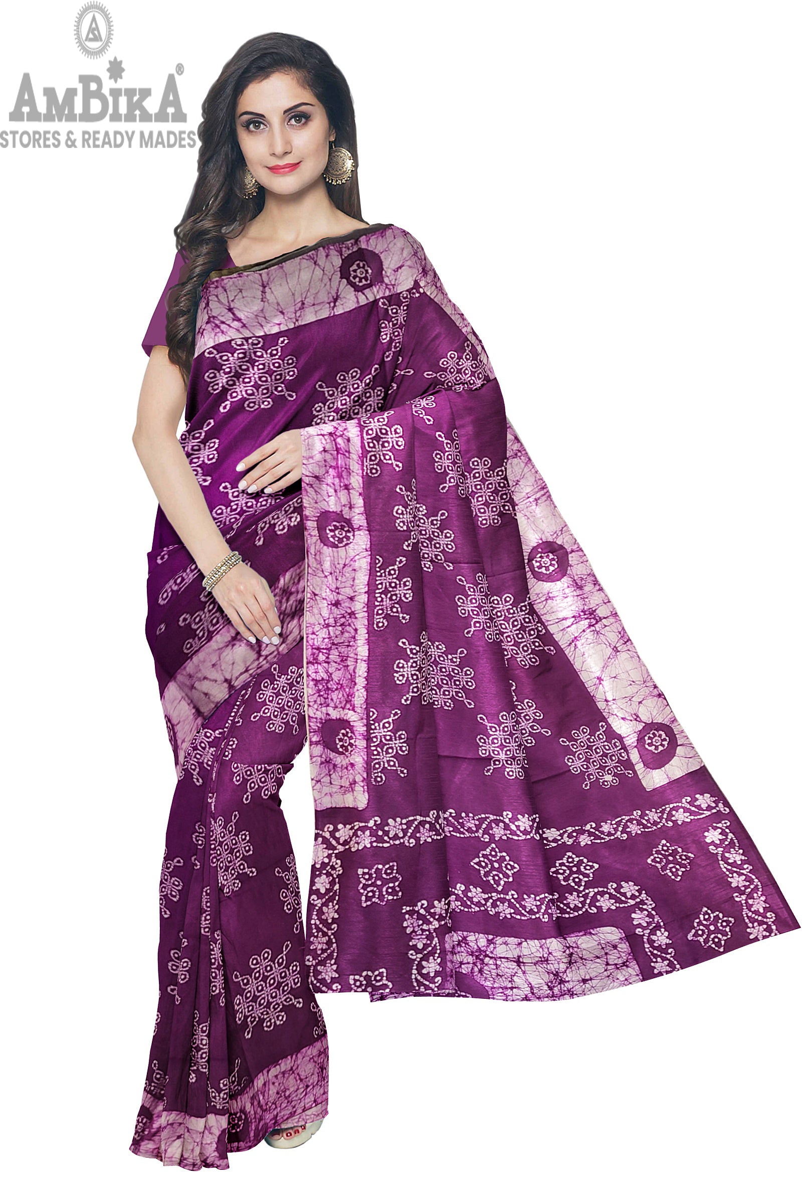 Women's Madurai Sungudi cotton saree -Hand Weaving and Wax Printed Unique Design without blouse Violet